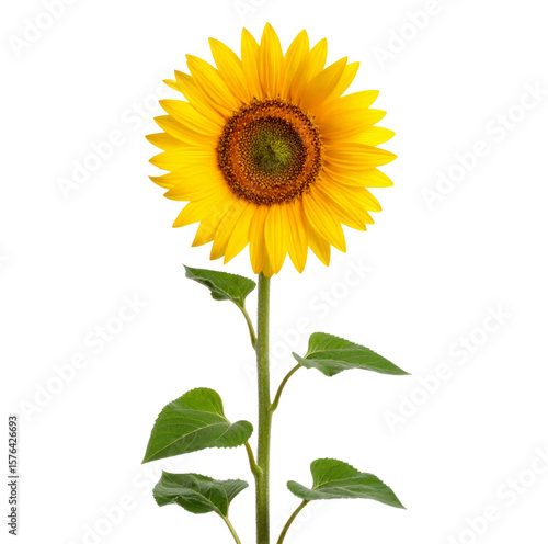 Girasol con tallo largo y hoja lateral mostrando su floración completa y estructura natural brillante