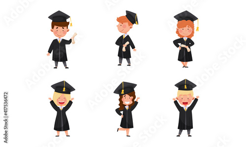 Girl and Boy Characters Wearing Academic Dresses or Gown and Square Academic Cap Cheering About Graduation Ceremony Vector Illustrations Set
