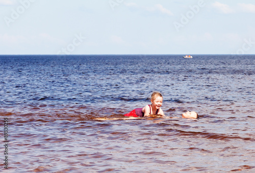 Girl and boy swimming in the lake