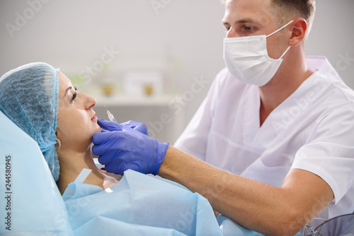 girl do plastic operation in medical clinic; doctor does lip augmentation surgery; injecting operation on lips