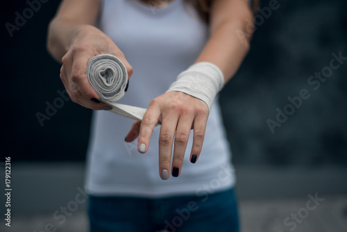 girl dressed in white t-shirt preparing for the competition waving her hands with a bandage