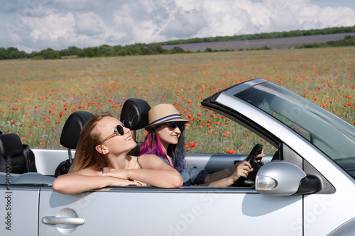 Girl driving a convertible car in a summer poppy field