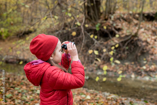 Girl hiking in the Autumn forest looking at nature and bird watching through binoculars. Little explorer. Outdoor recreation and awesome adventures with kids.