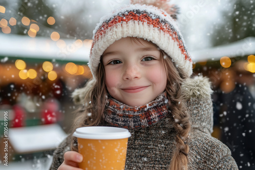 Girl holding a hot drink at a winter market