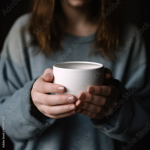 girl holding a white cup, mug in her hands, close up. AI generated content