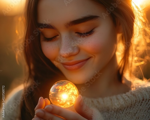 Girl Holding Tiny Glowing Globe, Smiling Gently, with Warm Sunlight Illuminating Her Face