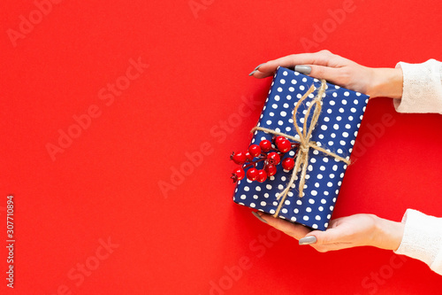Girl holds blue gift box in polka dots with sprig of hawthorn on a red background, merry christmas and happy new year concept, flat lay, top view
