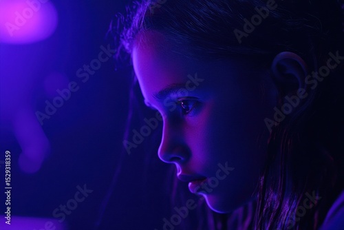 Girl Immersed in Neon Light - Contemplative Portrait in Dark Room.