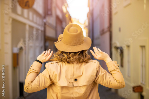 Girl in a beige hat and coat in narrow street of Prague city, Czech Republic
