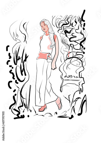 girl in graphic brush black and white background.