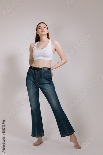 Girl in jeans and barefoot posing on a white background