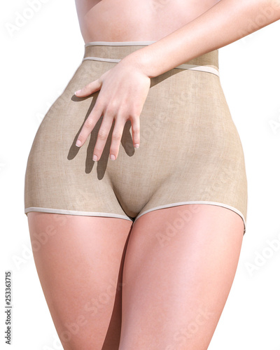 Girl in sexy panty. Transparent panties underwear. Extravagant fashion art. Woman standing candid provocative sexy pose. Photorealistic 3D rendering isolate illustration. Studio.