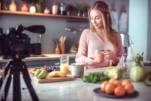 Girl is recording recipe on camera how to make healthy smoothie for her website or blog. Close-up. Generative Ai content
