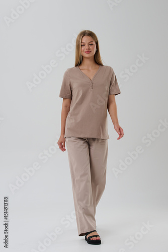 Girl model in casual clothes on a gray background posing in the studio.