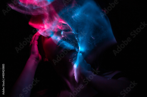 Girl, model photographed on a long exposure in the studio with color filters. Portrait