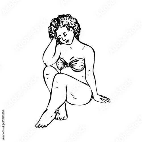 Girl plus size sitting in bikini, , hand drawn doodle, drawing in gravure style, sketch illustration