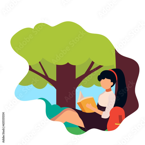 Girl reading book sitting under a tree flat style vector illustration, Girl with a ponytail sitting under a tree in a forest reading a book in nature flat style stock vector image