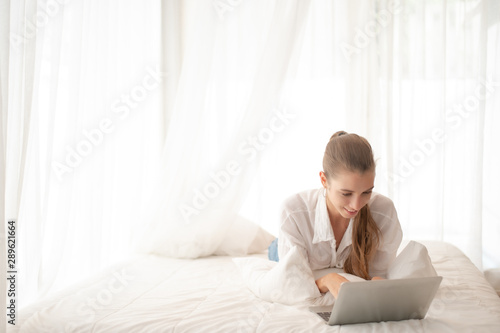 Girl relaxing holiday by listening to music on the bed. Girls working at home use laptops and the Internet.