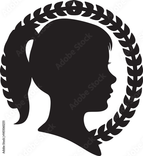 Girl Silhouette Profile with Ponytail in Laurel Wreath - Vector Icon
