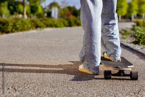 Girl Skateboarding in Park – Close-up of Legs in Jeans on Skateboard. Active lifestyle outdoors and youth culture, urban sports, freedom, and spending leisure time in a healthy and fun way.