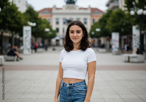 Girl smiles standing in a city square with building and people in the background
