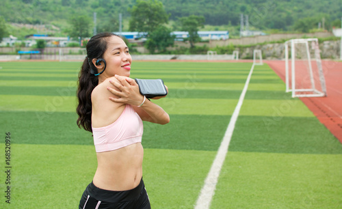 Girl stretching with modern jogging equipment for