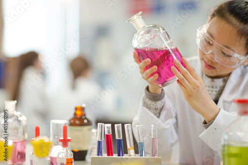 Girl student examining pink liquid, conducting scientific experiment in laboratory classroom
