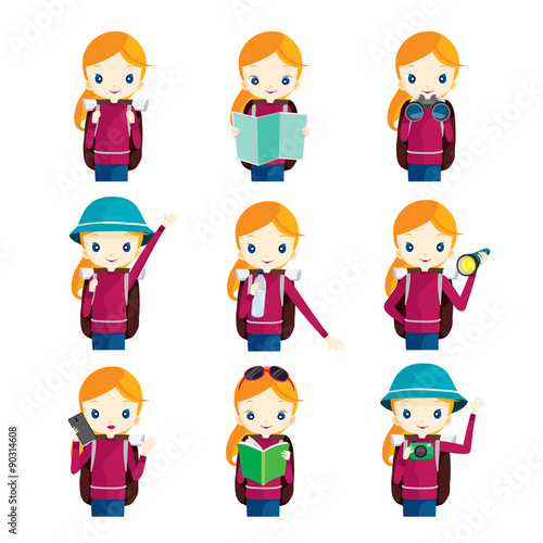 Girl traveling actions set, journey trips, adventure, transportation
