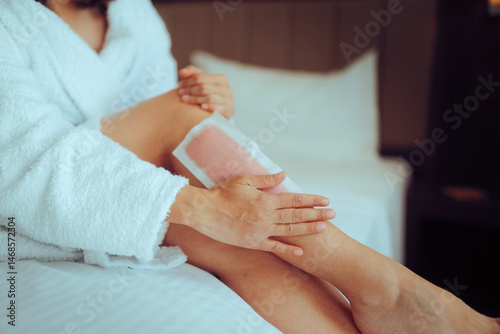 Girl Using Wax Strips on her Legs at Her Home. Woman gets rid of unwanted hair alone in the comfort of her bedroom