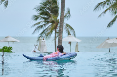 Girl wear goggles lying on floater in swimming pool with water splash on blur beach background