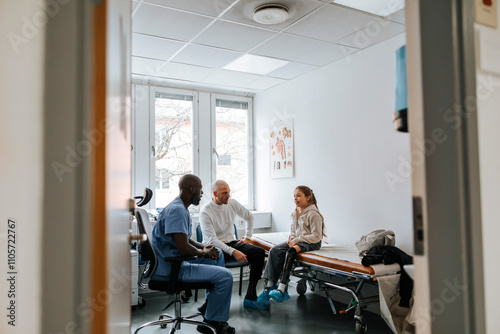 Girl wearing artificial limb sitting next to father on bed and discussing with male doctor in examination room
