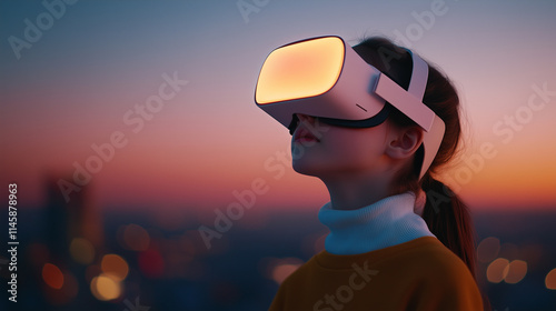girl wearing virtual reality headset against sunset backdrop, immersed in technology and exploration. scene captures sense of wonder and innovation.