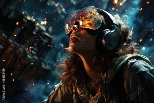 Girl wearing virtual reality headset. VR goggles innovation technology. Generative AI