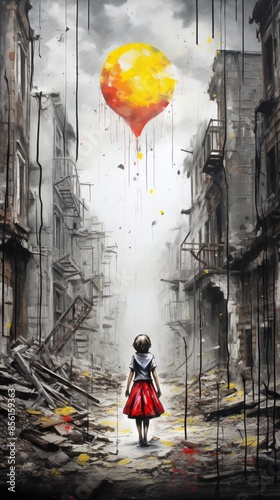 Girl with a balloon wandering through urban ruins, vibrant splash of color against grey debris, symbolizing resilience