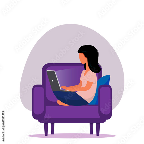 Girl with a laptop in a chair. Home office concept, woman working from home, student or freelancer. Vector illustration in flat style