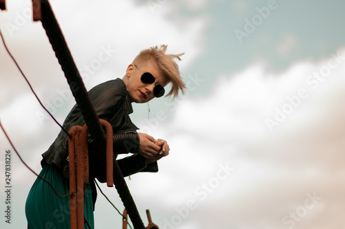 Girl with a short haircut on the bridge against the sky