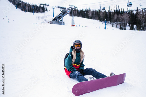 Girl with a snowboard on a snowy slope.