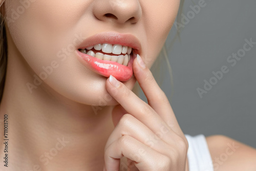 Girl with beautiful white teeth shows inflamed gums fingers, gum teeth problem