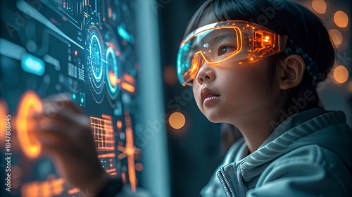 Girl with futuristic glasses interacting with a holographic interface of complex data