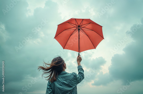 girl with red umbrella against sky background, view from back