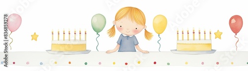 Girl with two cakes and balloons celebrating a birthday.