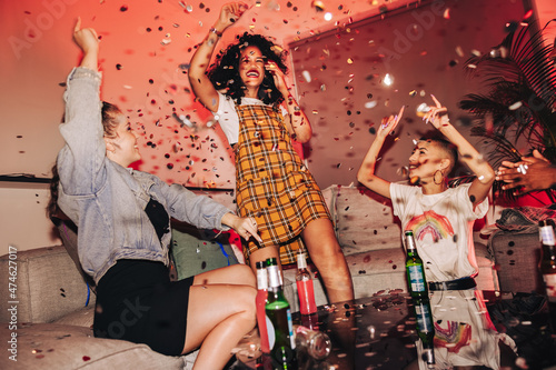 Girlfriends cheering happily at a house party
