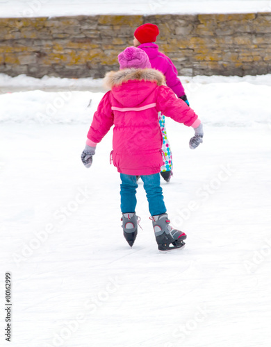 girls with ice skates with reflection on winter ice