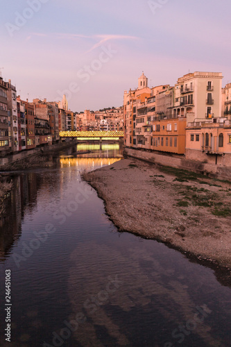 Girona's skyline famous landmark river view at the sunset. Onyar river and Cathedral skyline cityscape in famous city in Catalonia