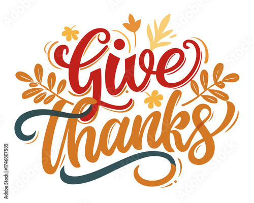 Give Thanks calligraphy lettering, rustic holiday design isolated on white background