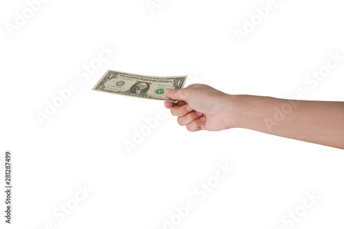 Giving concept, Hand giving one dollar usd with white background and clipping path