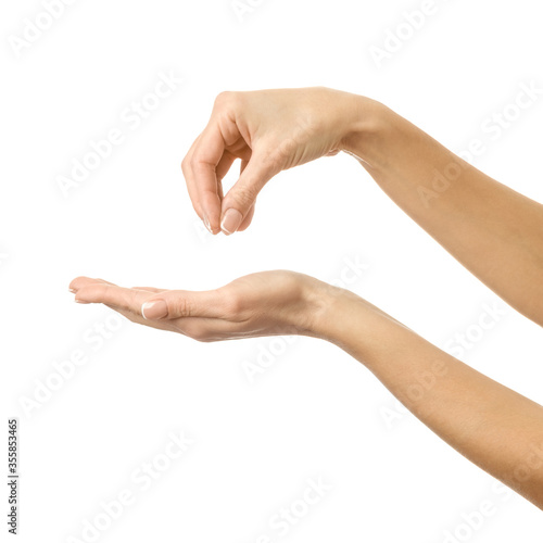 Giving, reaching or holding hand. Woman hand gesturing isolated on white