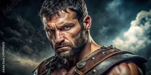 Gladiator with a clenched jaw and determined gaze, warrior, armor, ancient, Roman, battle, sword, helmet, fierce