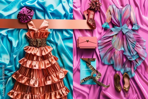 Glamorous Gown and Accessories Ensemble with Chic Party Invitation Banner