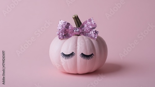 Glamorous Pink Pumpkin with Sparkly Bow and False Eyelashes on Light Pink Background